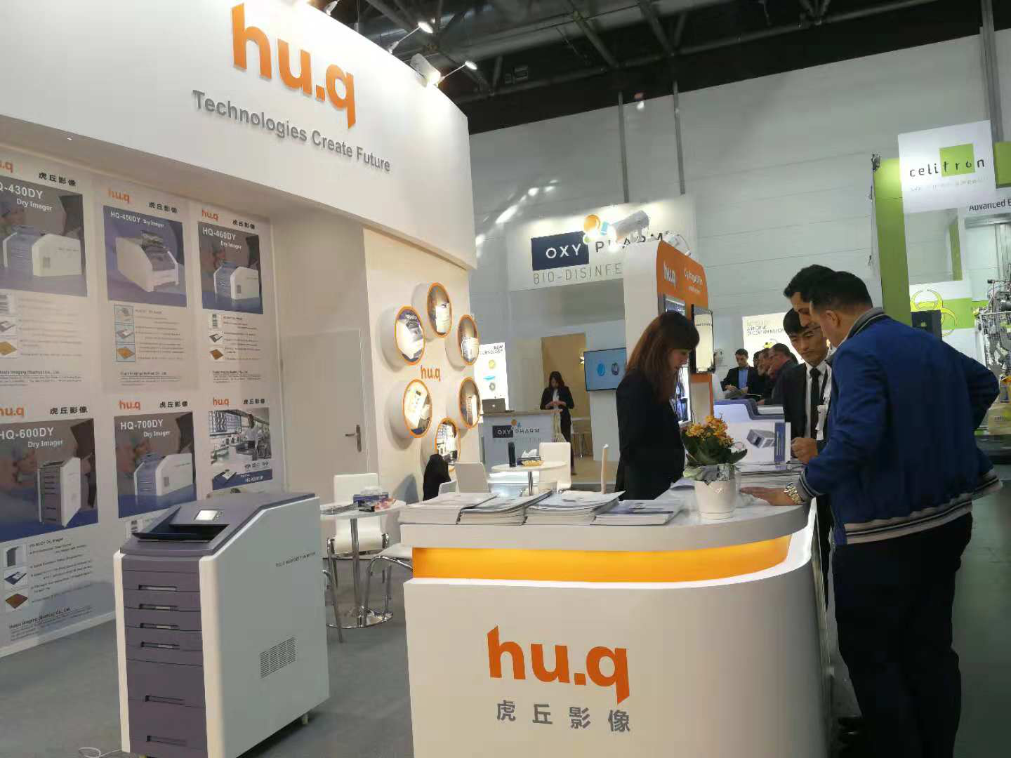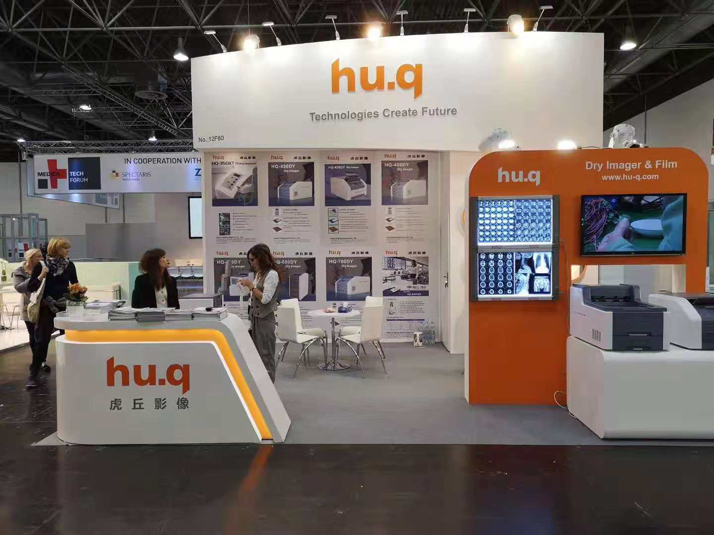本次MEDICA展會(huì)吸引了來(lái)自130多個(gè)國(guó)際和地區(qū)的5000多家公司前來(lái)參展?;⑶鹩跋竦恼古_(tái)位于H12-F60, 展臺(tái)風(fēng)格簡(jiǎn)潔、大方,以橙色和白色基調(diào)為主,輔以燈光映射,在展區(qū)顯得尤為突出。