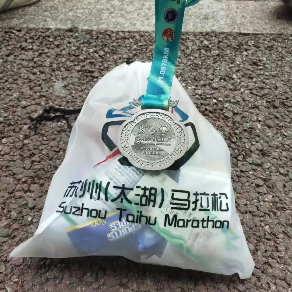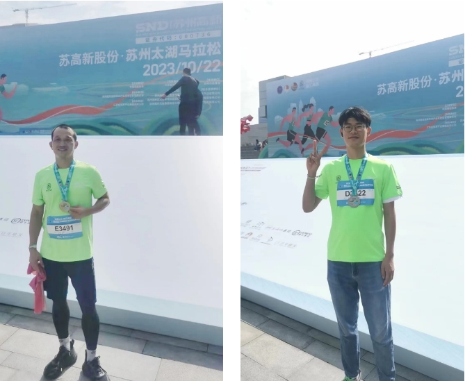 參加半馬的兩位員工到達(dá)終點,獲得獎牌